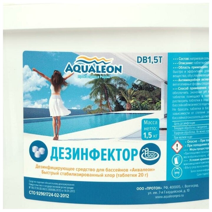 Средство для обеззараживания воды в бассейнах Aqualeon DB1.5T в таблетках по 20 г, быстрый (банка,1,5 кг) информация: