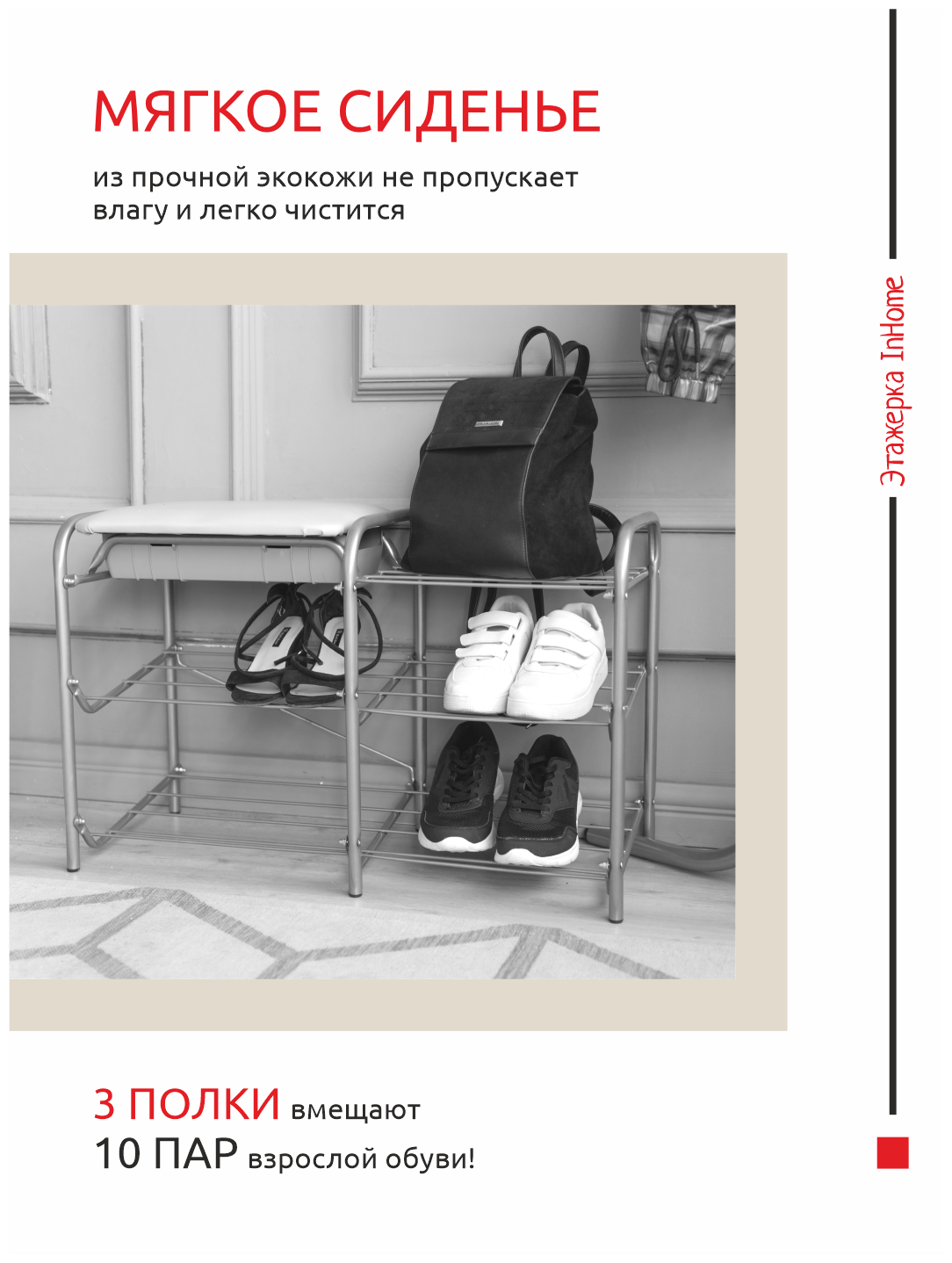 Этажерка, обувница, металлическая с мягким сиденьем и ящиком InHome INHSR4/5