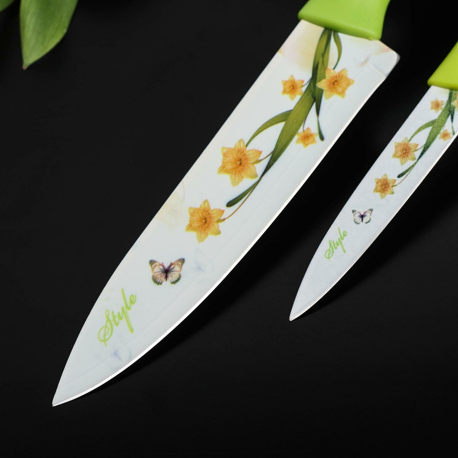 Набор кухонный Доляна "Нарцисс", 3 предмета: 2 ножа с антиналипающим покрытием, лезвие 12 см, овощечистка, 20x4 см, цвет зелёный