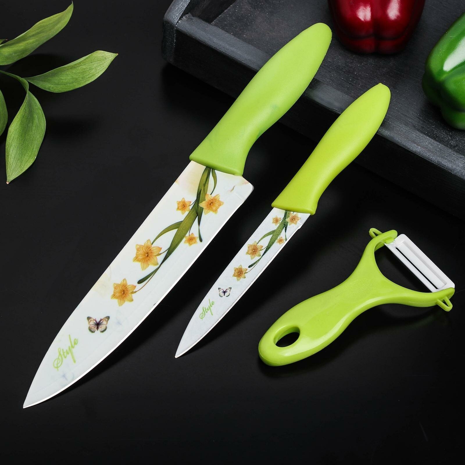 Отзывы на Набор кухонный Доляна «Нарцисс», 3 предмета: 2 ножа с антиналипающим покрытием, лезвие 12 см, овощечистка, 20×4 см, цвет зелёный