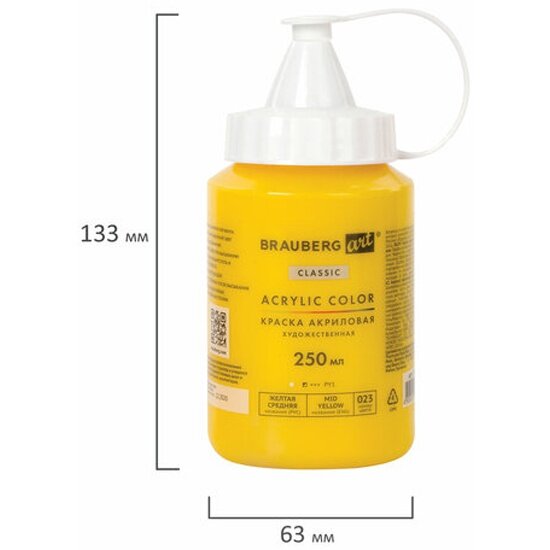 Краска BRAUBERG акриловая художественная ART CLASSIC, флакон 250 мл, желтая средняя, 191714 информация: