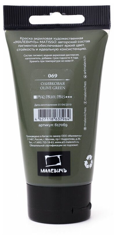 Краска акриловая художественная 1 цвет, 60мл, цвет оливковый, туба ПВХ Matisso Малевичъ 617069 - 1 шт. информация: