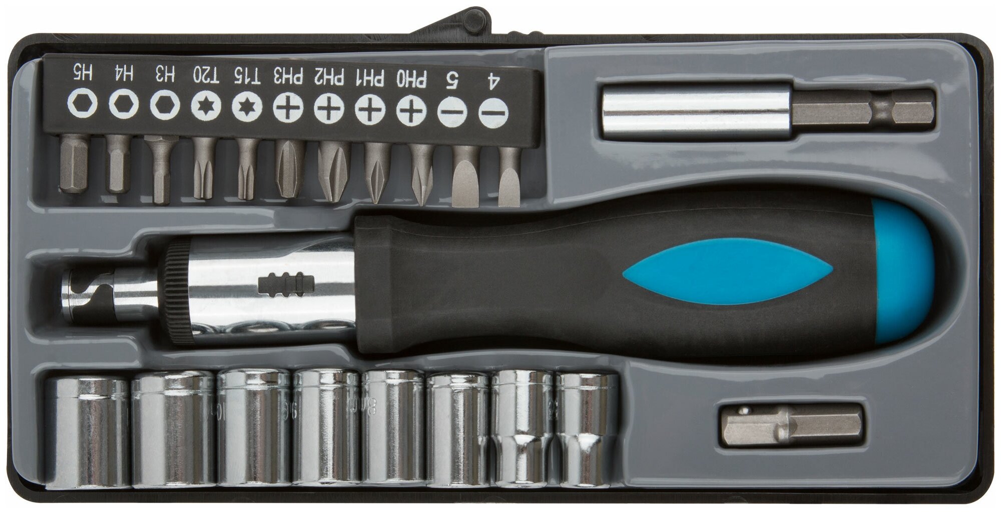 10 цен на Отвертка FIT 56305 реверсивная, 22 CrV бит и головок, прорезиненная ручка, в чемоданчике