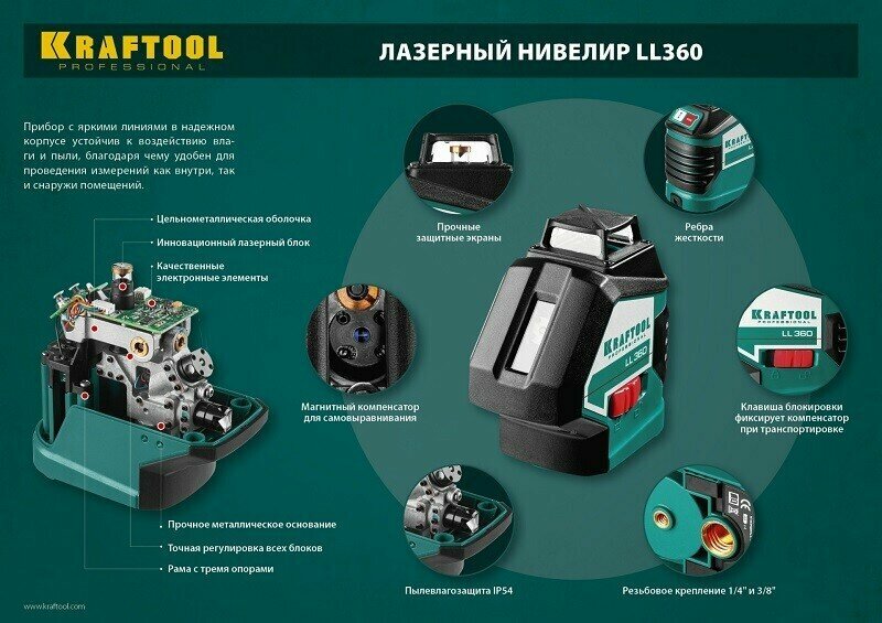 KRAFTOOL LL360 нивелир лазерный, 2х360 , 20м-70м, IP54, точн. +/-0,2 мм/м, в коробке информация: