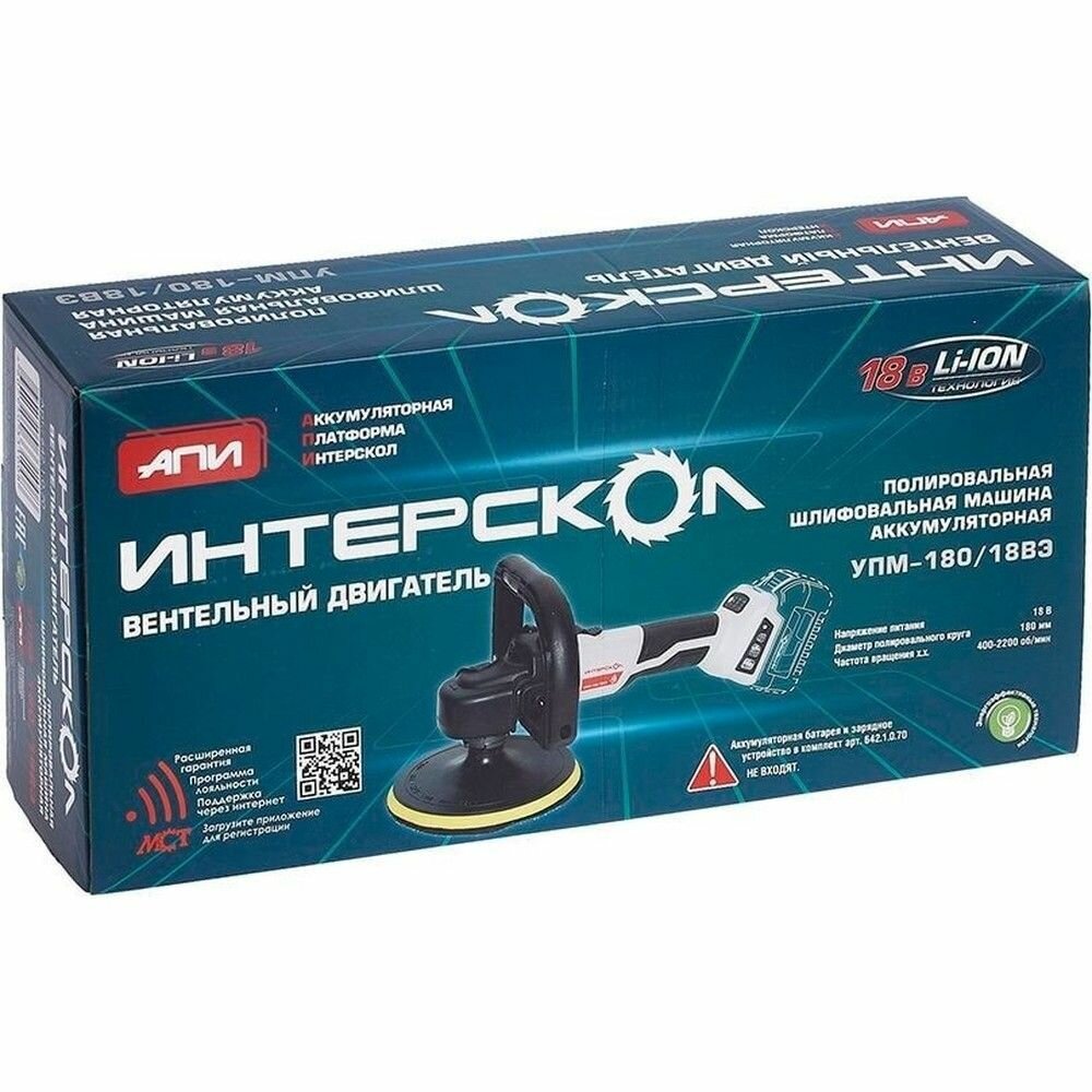 Шлифмашина полировальная ИНТЕРСКОЛ УПМ-180/18ВЭ без АКБ и ЗУ аккумуляторная информация: