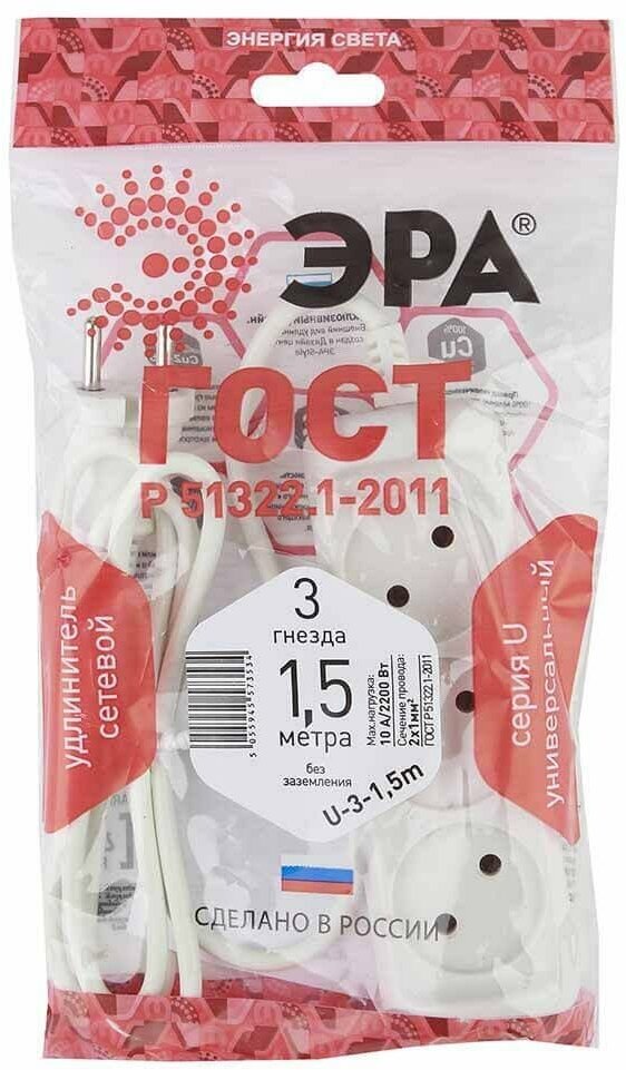 Удлинитель ЭРА U-2-1,5m (Б0028359), 2 розетки, 1.5 м, б/з, 10А / 2200 Вт