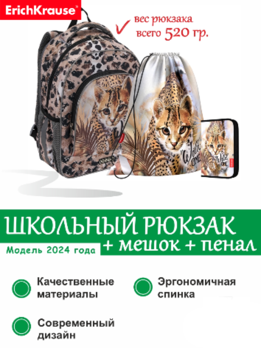 Школьный рюкзак ErichKrause® ErgoLine® 15L Wild Cat с наполнением 48459/1 информация: