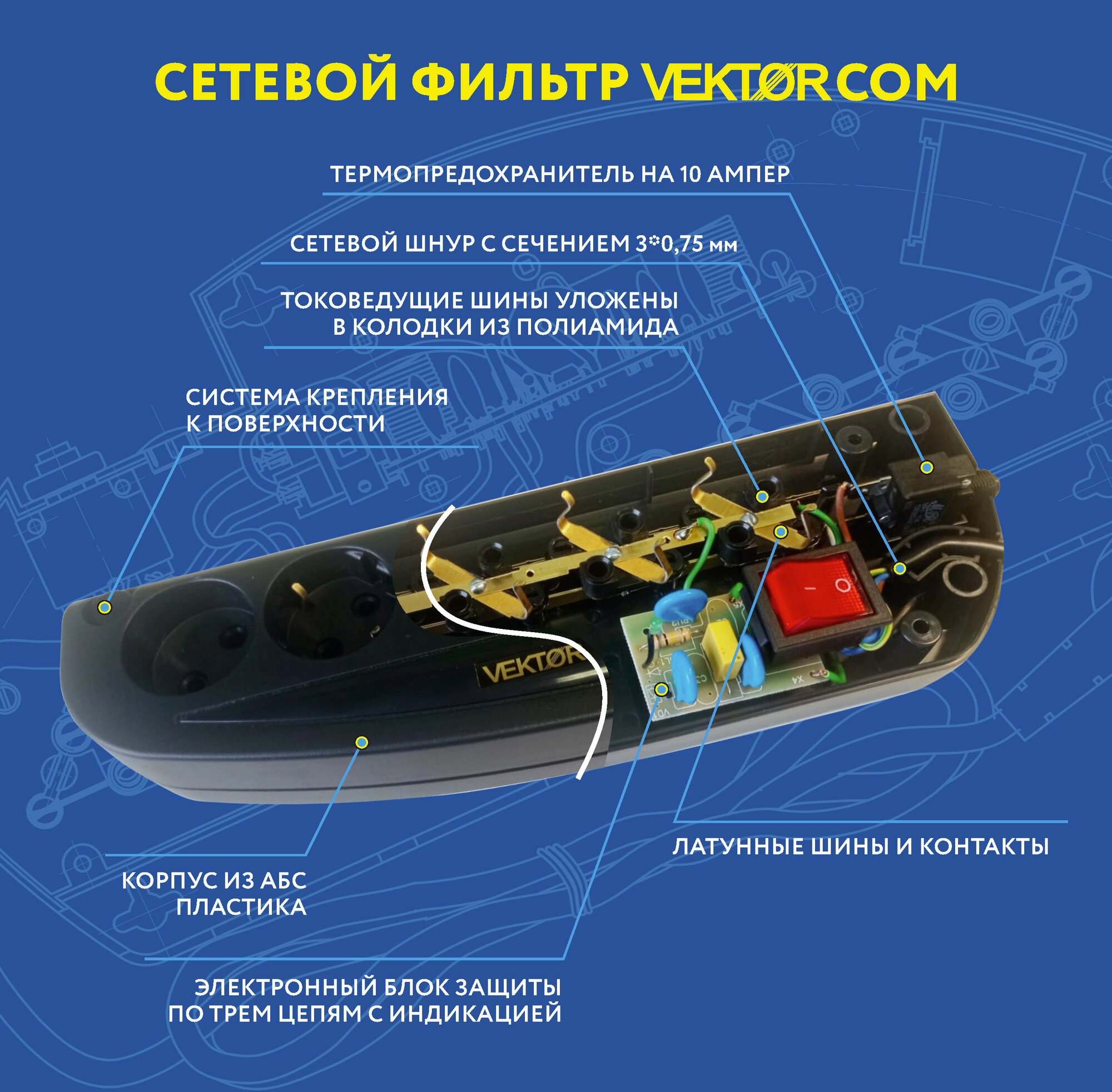 Сетевой фильтр Vektor COM черный 3м (компьютерный) информация: