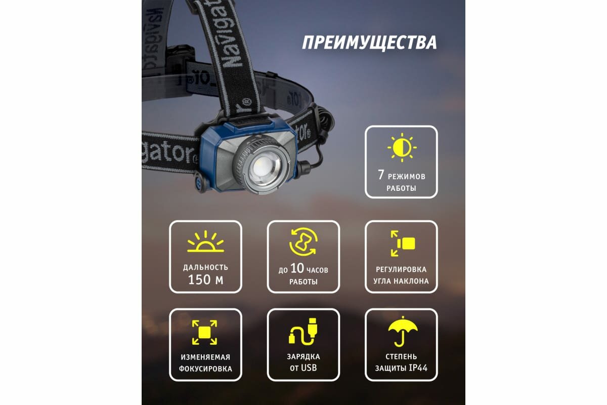 Фонарь налобный Navigator 14 238, 7 резимов работы, аккум. Li-ion 2000 мА/ч 3 423 ₽