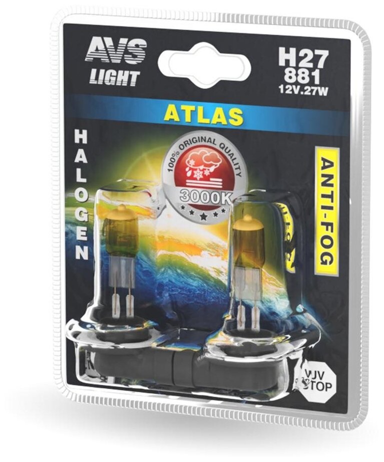 Лампа галогенная AVS ATLAS ANTI-FOG / желтый H27/881 12V.27W (блистер, 2 шт.)