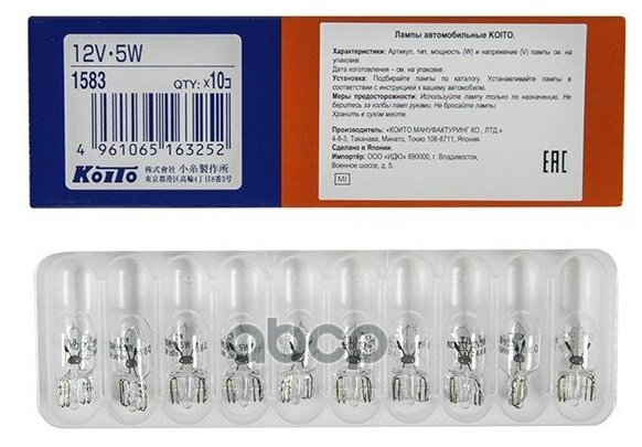 10 цен на Лампа галогенная Koito W5W (W2.1x9.5d) 12V 5W, 1583, 1 шт
