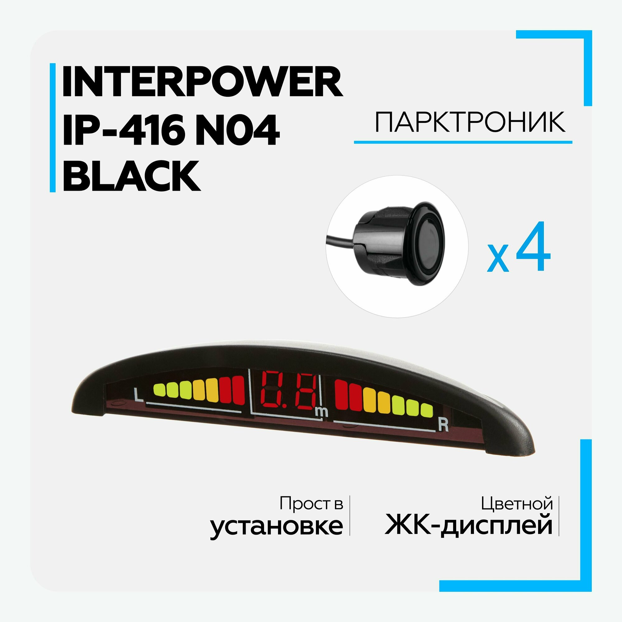 Парктроник Interpower IP-416 N04 Black для заднего и переднего бампера, 4 датчика, цвет черный, 19мм, с дисплеем