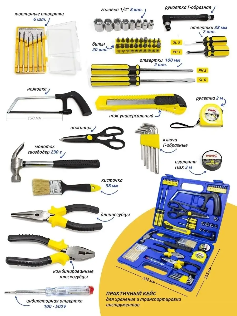 | Инструменты в комплекте | отвёртки / плоскогубцы / длинногубцы / ножовка по дереву / отвёртки для точных работ / рукоять для головок / рулетка / ключи г-образные / кисточка / Изолента / ножницы / нож / молоток-гвоздодер |