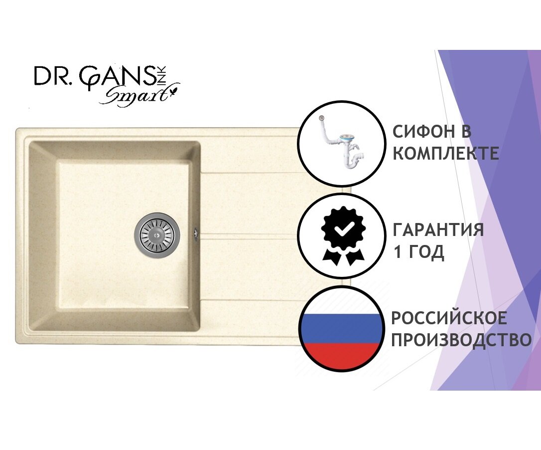 Каменная мойка / раковина для кухни Dr.Gans Smart оливия 740 прямоугольная с крылом, врезная 740х480х200 мм (дюна) сифон в комплекте