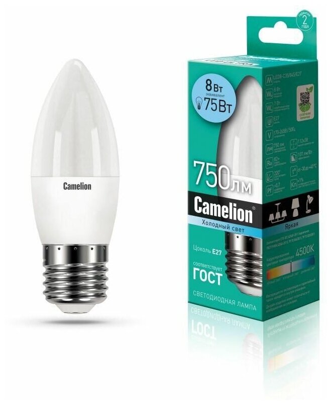 Отзывы на Camelion Лампа светодиодная LED8-C35/845/E27 8Вт свеча 4500К бел. E27 750лм 170-265В Camelion 12390