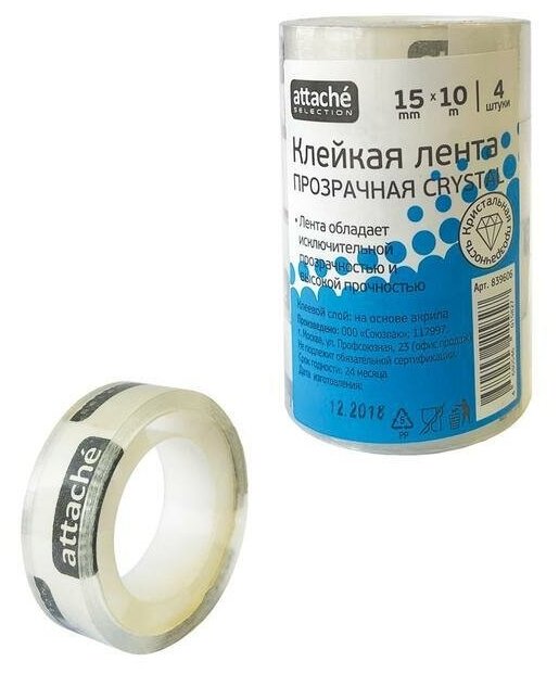 Клейкая лента канцелярская Attache Selection прозрачная 15 мм x 10 м (4 штуки в упаковке) информация: