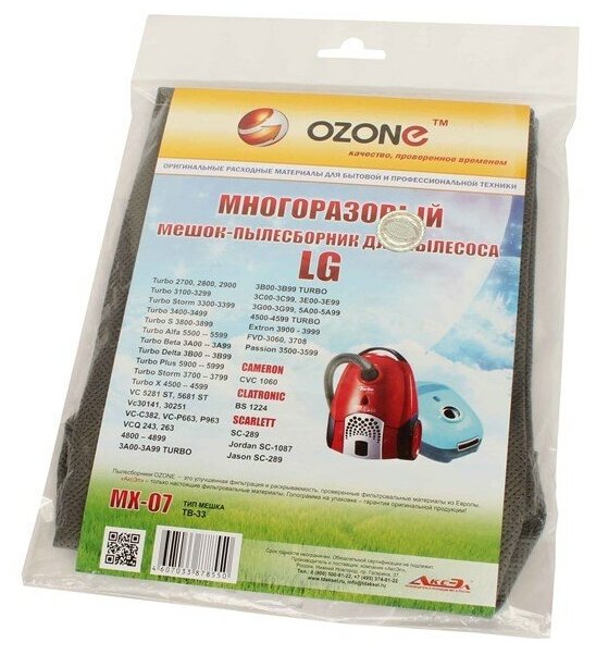 Многоразовый мешок-пылесборник Ozone MX-07 для пылесосов LG, MOULINEX, SCARLETT, 1 шт информация: