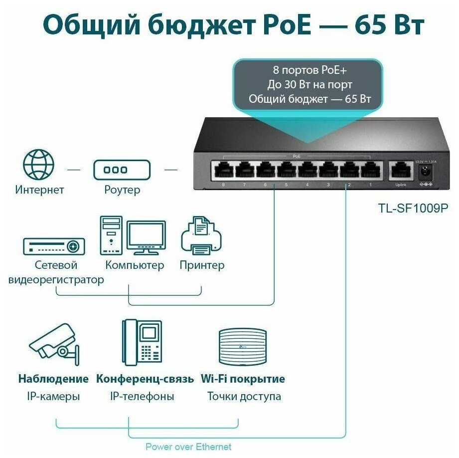 | Выходная мощность PoE (общий бюджет) | 65 Вт |