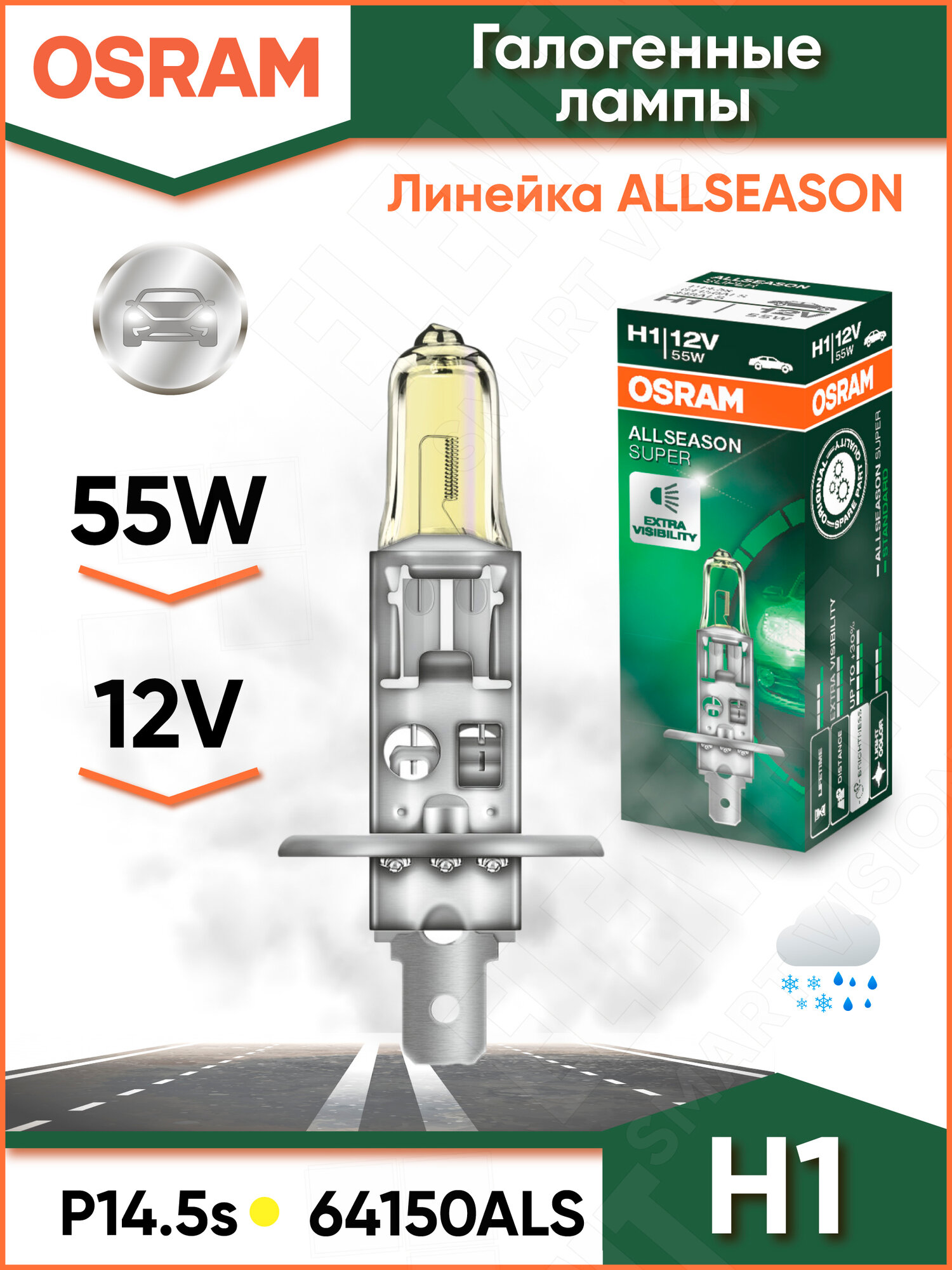 Лампа H1 12v 55w P14.5s Allseason +30% Больше Света, Цветовая Температура 3000к 1 Шт. Osram арт. 64150ALS 1 580 ₽