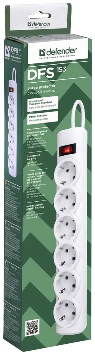 Сетевой фильтр Defender DFS 153, 6 розеток, 3 м, с/з, 10А / 2200 Вт белый