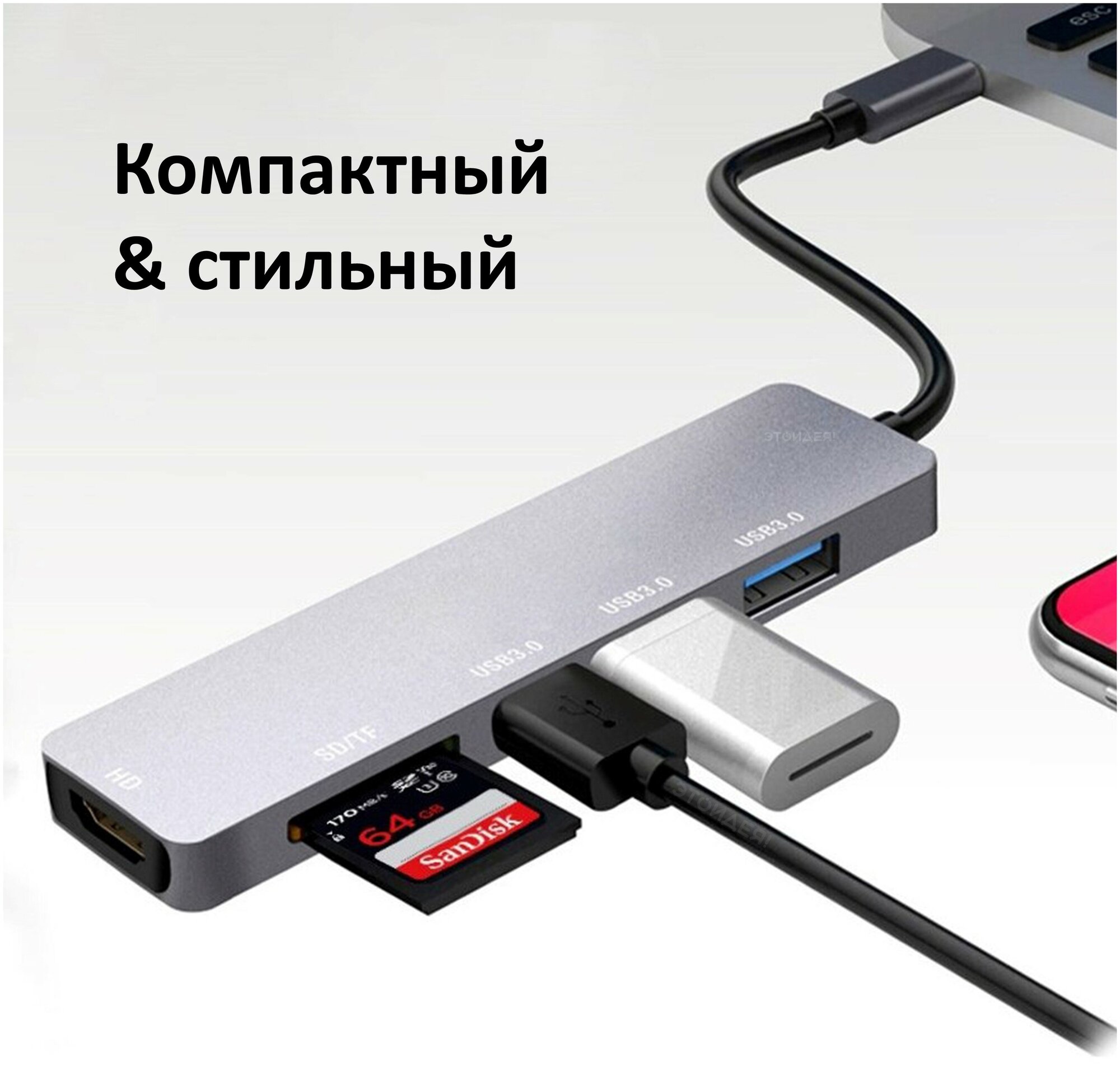 Отзывы на Переходник 6 в 1 с Type-C на 3х USB 3.0 и HDMI с кардридером для карт памяти SD, microSD, темно-серый алюминий / хаб для MacBook, ноутбука, компьютера