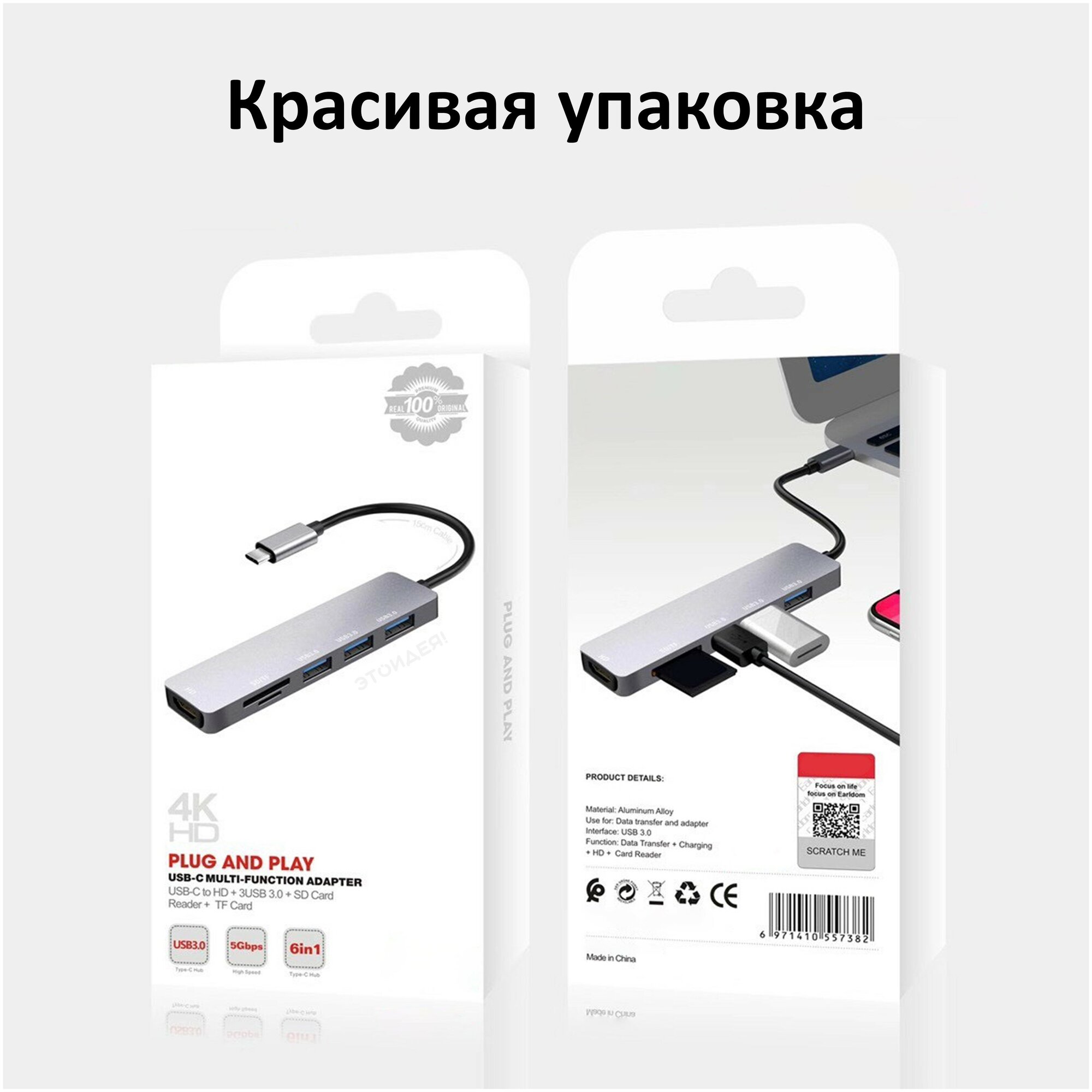 Переходник 6 в 1 с Type-C на 3х USB 3.0 и HDMI с кардридером для карт памяти SD, microSD, темно-серый алюминий / хаб для MacBook, ноутбука, компьютера информация: