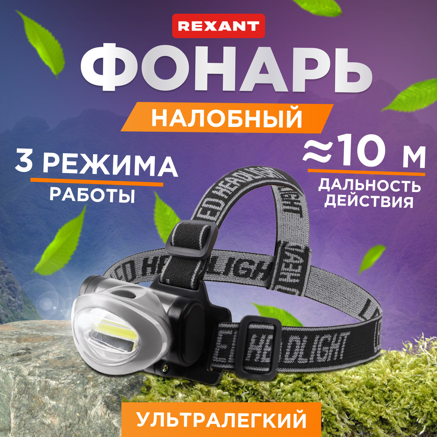 Налобный светодиодный фонарь REXANT СОВ с широким углом освещения, 3 режима