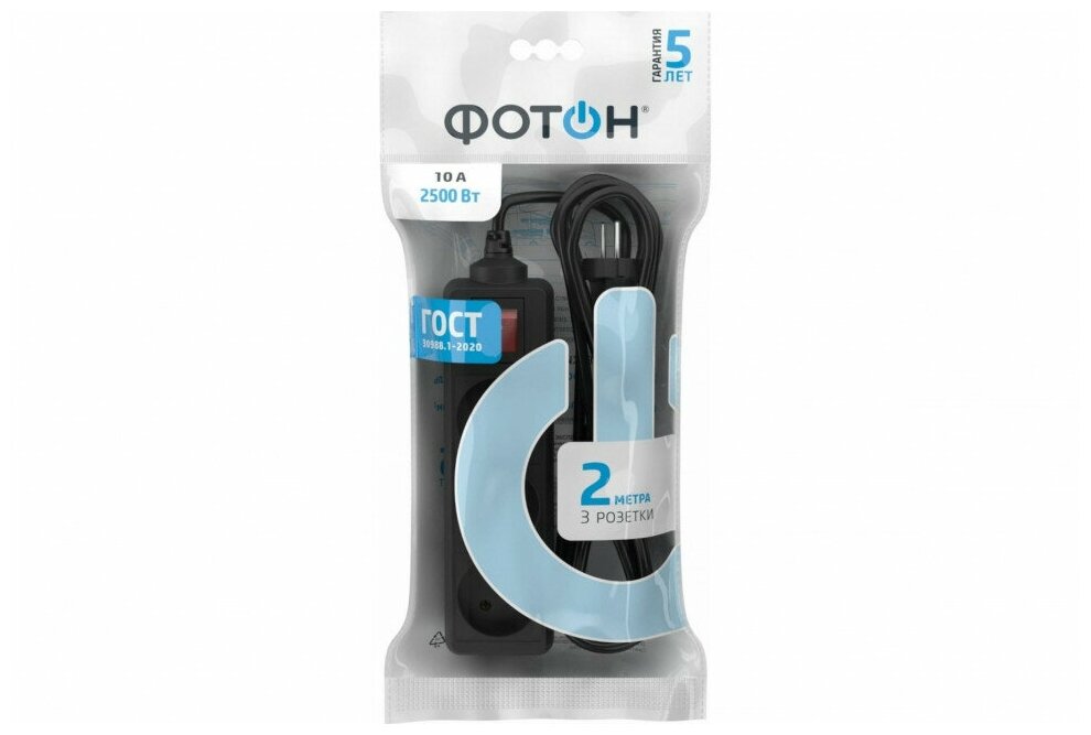 Удлинитель сетевой для розетки фотон 10А 2 метра 3 розетки с выключателем черный, ГОСТ 515 ₽