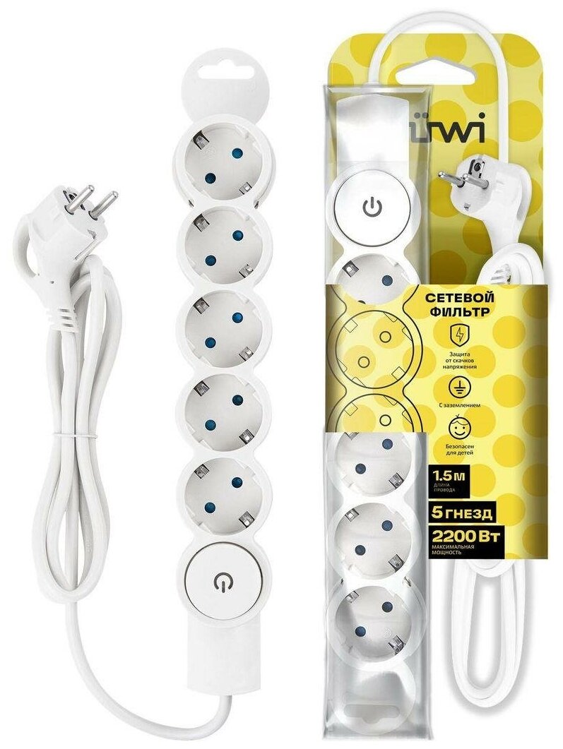 Сетевой фильтр 5 гнезд 1,5м белый REV (Uniel) информация: