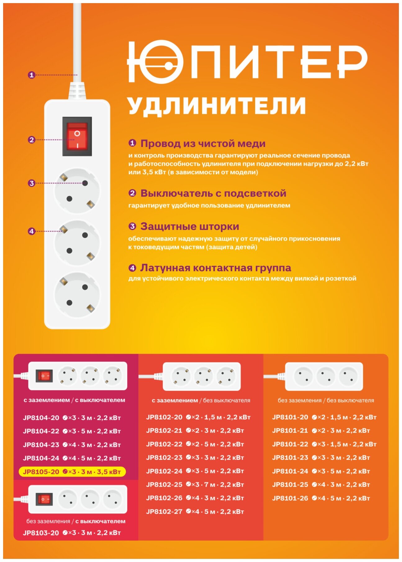 10 цен на Удлинитель 3м (3 роз, 2,2кВт, с/з, выкл, ПВС 3х0,75) Юпитер (JP8104-20) (юпитер)