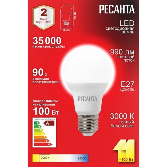 Лампа светодиодная LL-R-A60-11W-230-3K-E27 (груша11Вттепл.Е27) Ресанта информация: