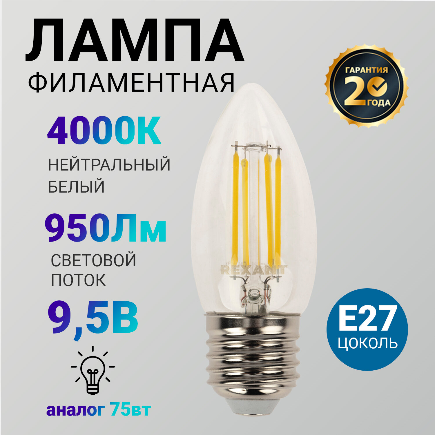 Лампа филаментная Rexant Свеча CN35, 9.5 Вт, 950 Лм, 4000K, E27 в прозрачной колбе информация: