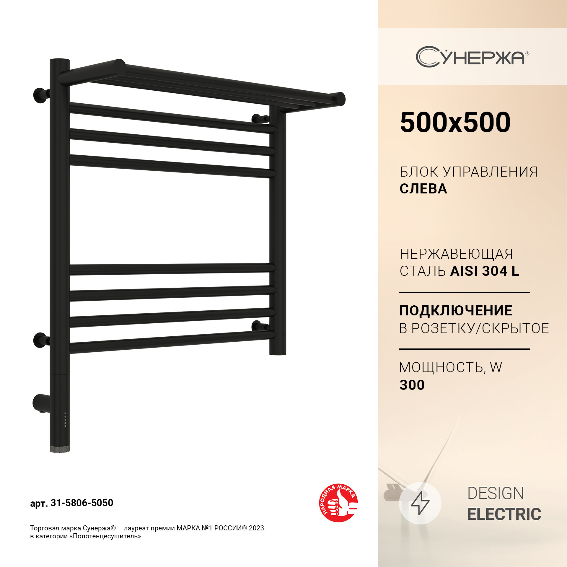 Полотенцесушитель электрический Сунержа Богема с полкой 3.0 500х500 / МЭМ левый Матовый чёрный информация: