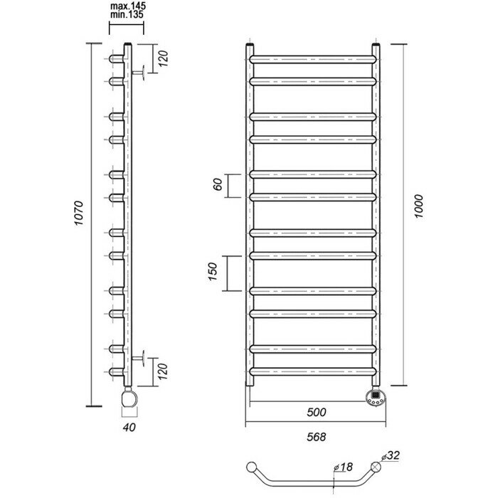 Полотенцесушитель электрический Domoterm Лаура П12 500х1000 ER справа информация: