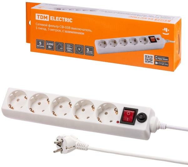10 цен на TDM SQ1304-0018 Сетевой фильтр СФ-05В выключатель, 5 гнезд, 5 метров, с/з, ПВС 3х0,75мм2 10А/250В белый