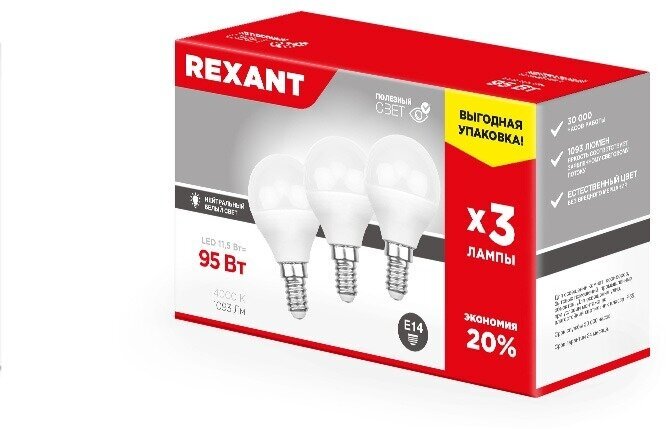 Светодиодная лампа Rexant Шар E14, 11.5 Вт, 1093 Лм (=95 Вт), 4000 K (нейтральный свет), упаковка 3 шт. информация: