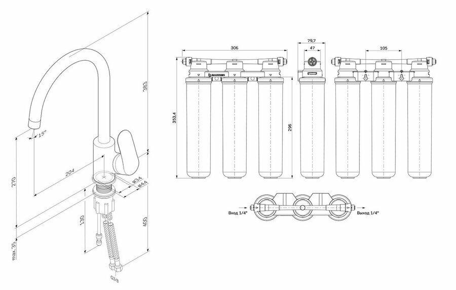 Смеситель для кухни с подключением к фильтру с питьевой водой из нержавеющей стали SUS304 Calorie CAL50116-3