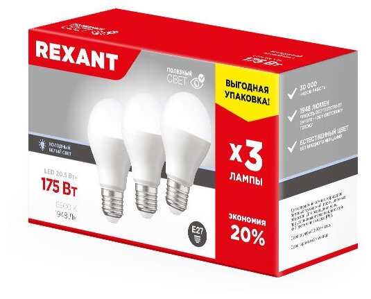 Светодиодная лампа REXANT Груша E27, 20.5 Вт, A70, 1948 Лм (=175 Вт), 6500 K (холодный свет), упаковка 3 шт. информация: