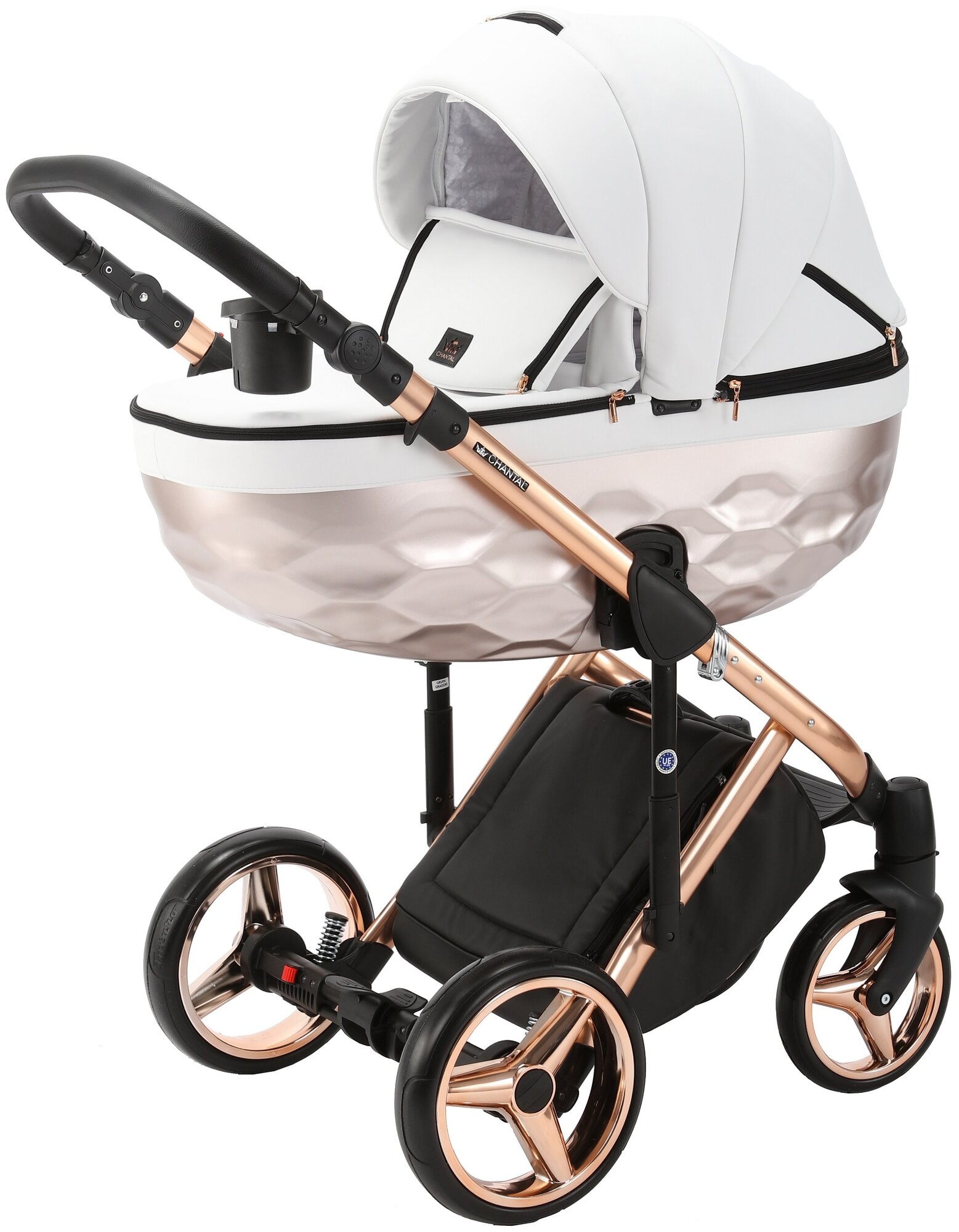 Коляска для новорожденных Adamex Chantal Star Deluxe, прогулочная универсальная детская коляска 2 в 1 белая эко-кожа с золотом
