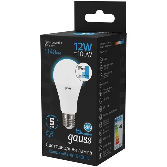 Светодиодная лампа Gauss A60 12W 1140lm 6500K Е27 шаг. диммирование LED 1/10/50 информация: