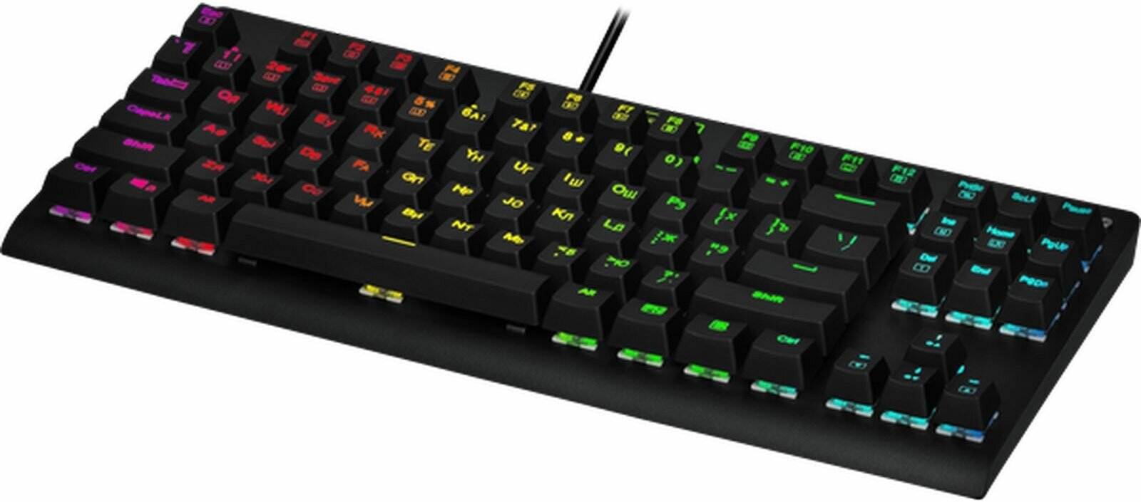 | Дополнительная информация | программируемая RGB подсветка, регулируемая яркость подсветки; повышенная износостойкость ресурс нажатия клавиш - до 50 млн, позолоченный USB-коннектор, высокопрочный долговечный кабель; аппаратная блокировка клавиши WIN во время игры; влагоустойчивая конструкция клавиатуры; звонкий звук/щелчок переключателей |