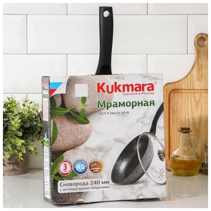 Отзывы на KUKMARA Сковорода, d=24 см, с ручкой, стеклянная крышка, антипригарное покрытие, тёмный мрамор