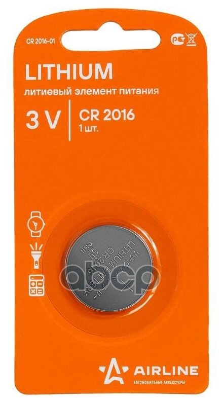 Батарейка для брелока сигнализации AIRLINE, литиевая, типоразмер CR2016, 1шт