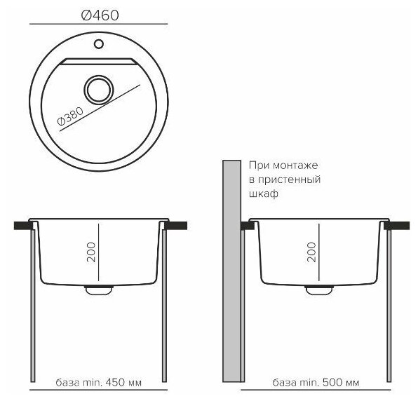 Мойка POLYGRAN, гранит-мрамор, ATOL-460, (d=460*200 мм), черный, сифон и сливная арматура