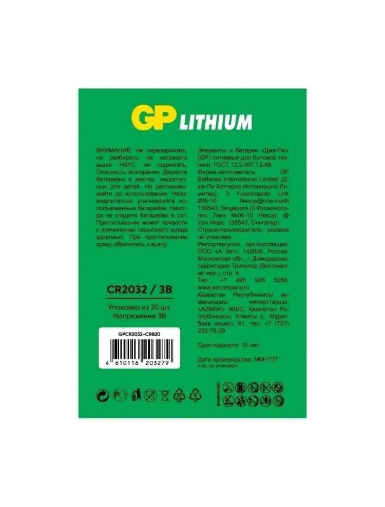 Батарейка CR2032 3V GP Blister, 20 шт. информация: