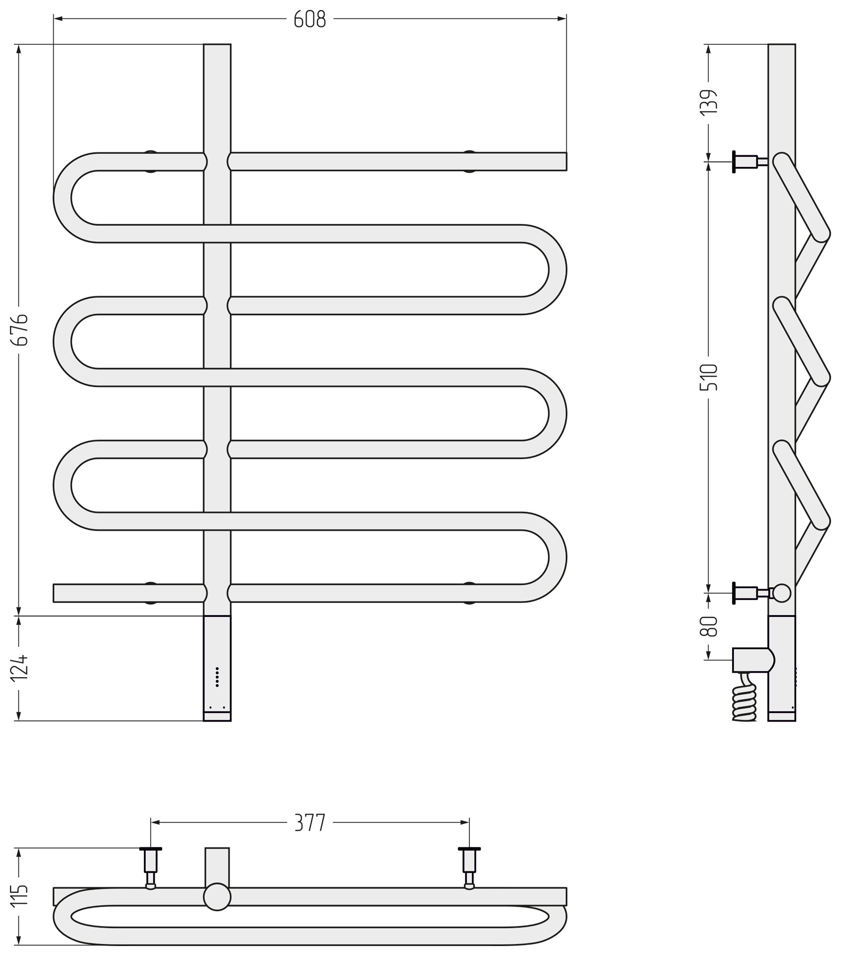 Полотенцесушитель дизайнерский электрический, профильный BAU Stella 8х80, 2 коллектора, 3 крючка (Белый DB-0071)
