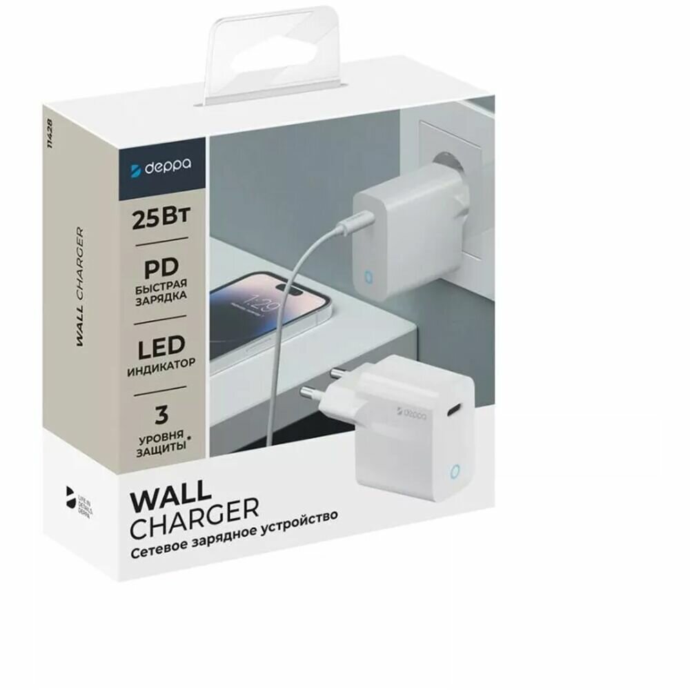 10 цен на Сетевое зарядное устройство Deppa Power Delivery 25W USB Type-C белый (11428)