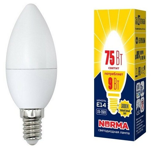 Volpe LED-C37-9W/WW/E14/FR/NR Лампа светодиодная. Форма "свеча", матовая. Серия Norma. Теплый белый свет (3000K). Картон. ТМ Volpe