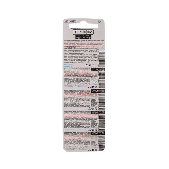 10 цен на Трофи Батарейка алкалиновая "Трофи" Alkaline, А27 (MN27)-5BL, 12В, блистер, 5 шт.
