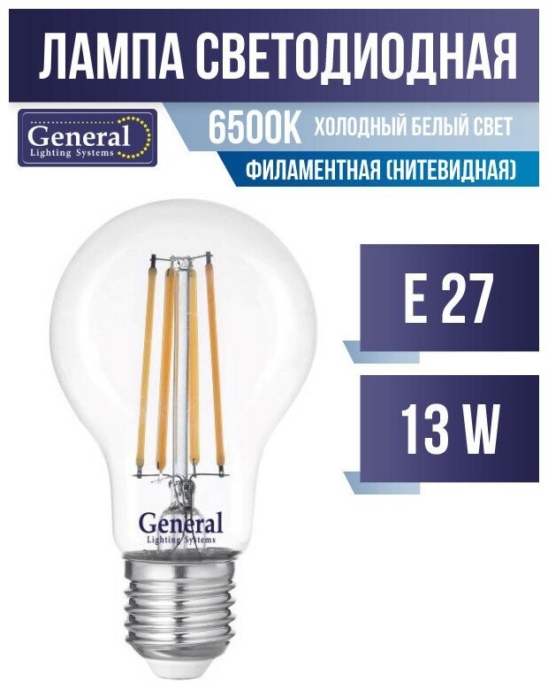 Лампа филамент светодиодная 13Вт груша General 649400 GLDEN-A60S-13-230-E27-6500 информация: